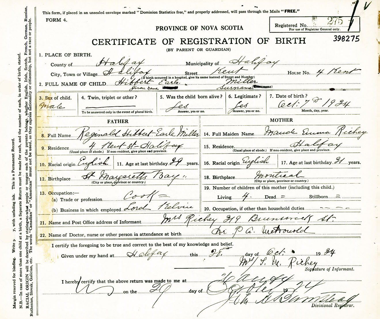 Male Birth Registration: Year: 1924 number: 39800275