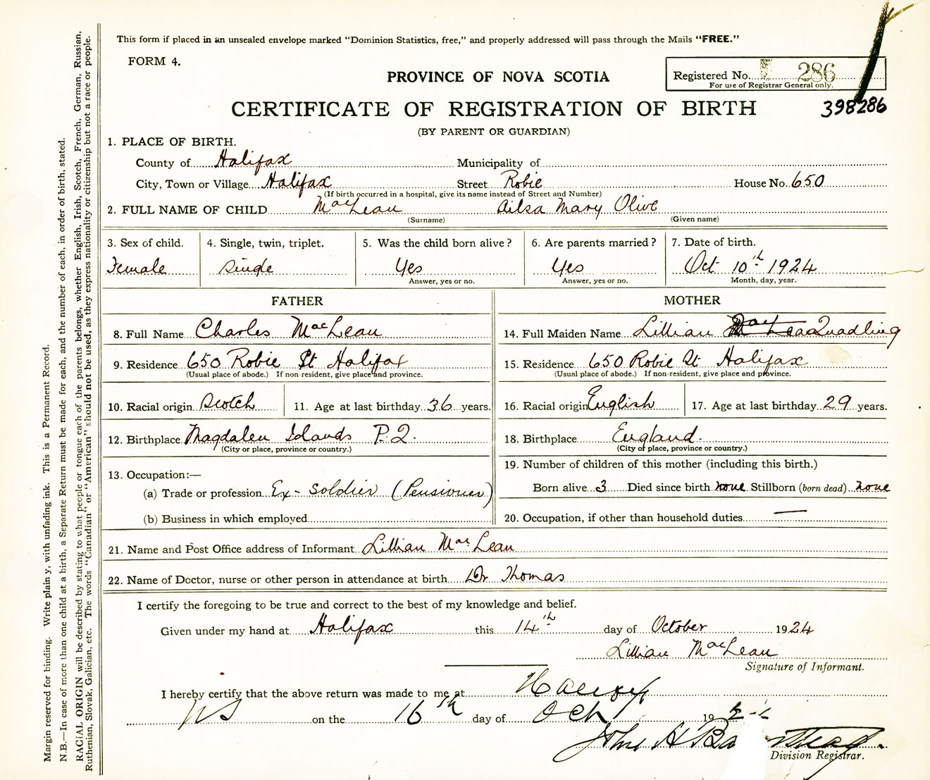 Female Birth Registration: Year: 1924 number: 39800286