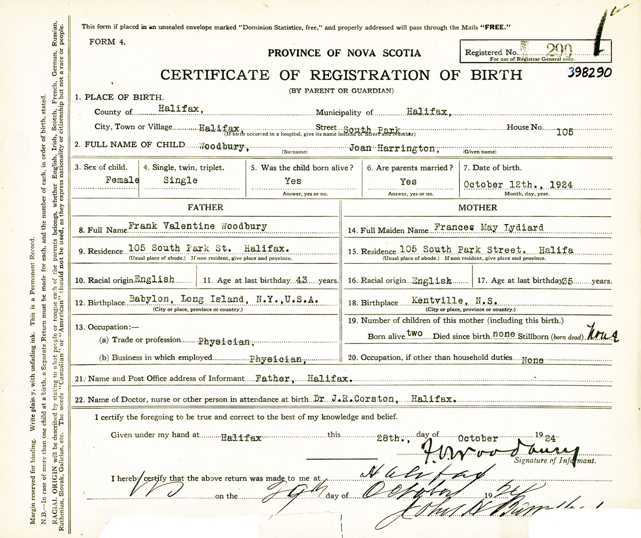 Female Birth Registration: Year: 1924 number: 39800290