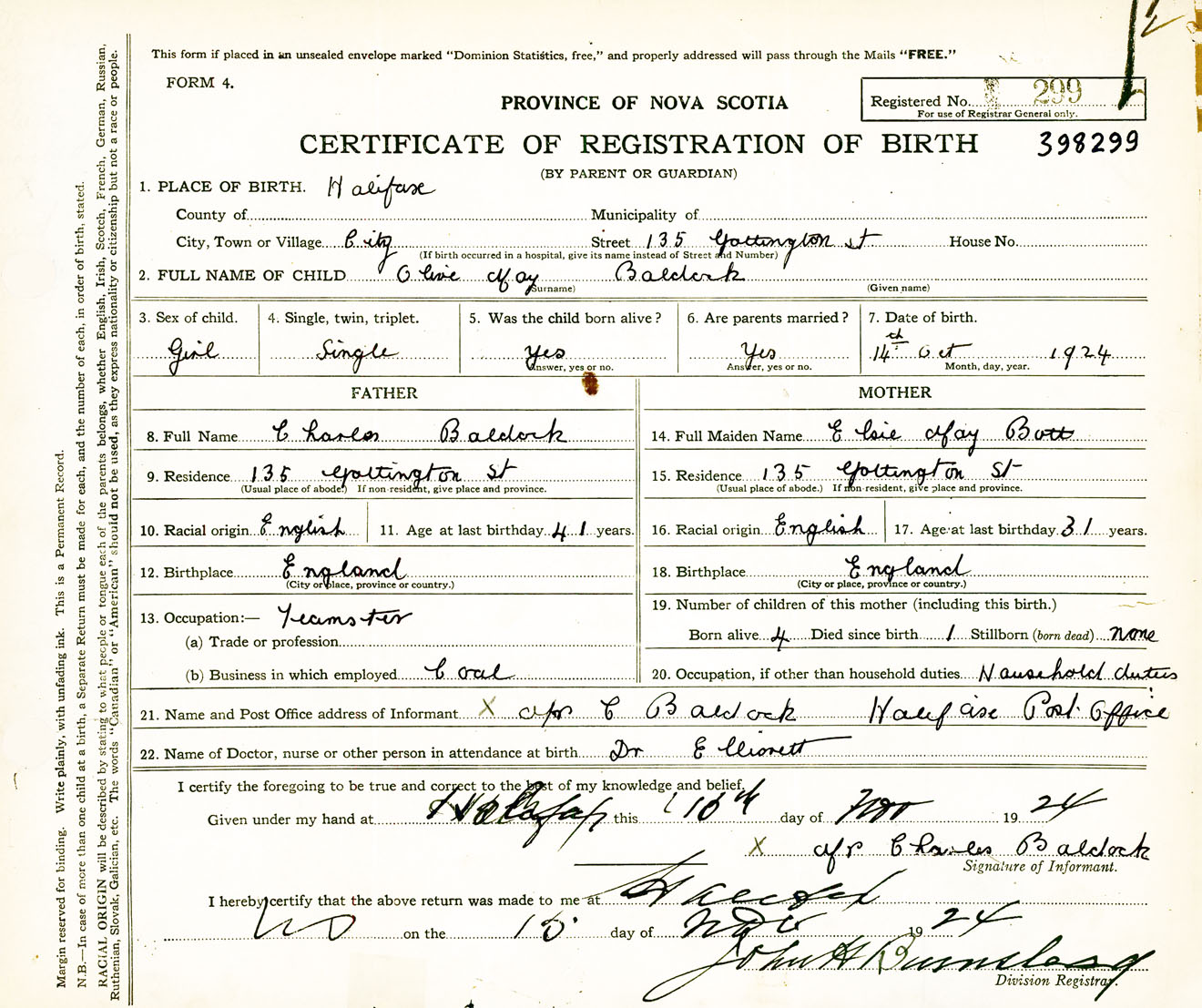 Female Birth Registration: Year: 1924 number: 39800299
