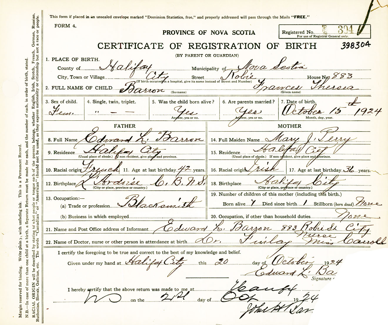 Female Birth Registration: Year: 1924 number: 39800304