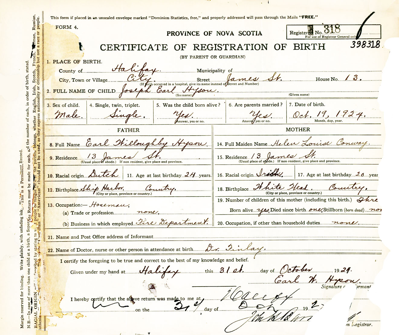 Male Birth Registration: Year: 1924 number: 39800318