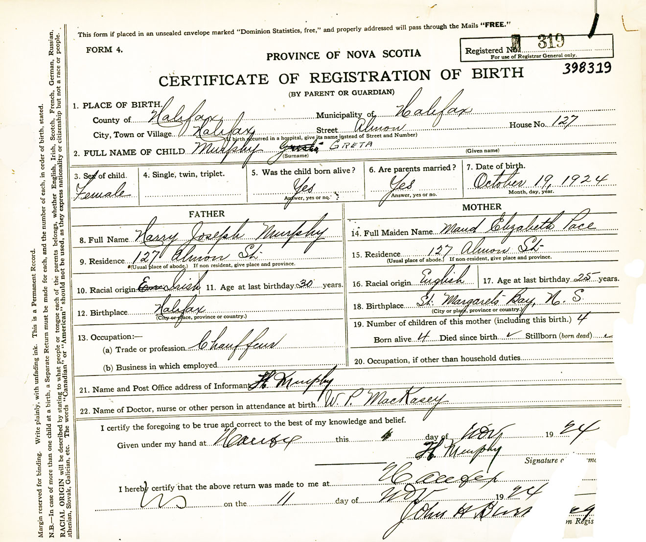 Female Birth Registration: Year: 1924 number: 39800319