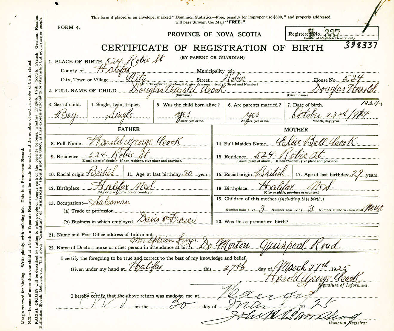 Male Birth Registration: Year: 1924 number: 39800337