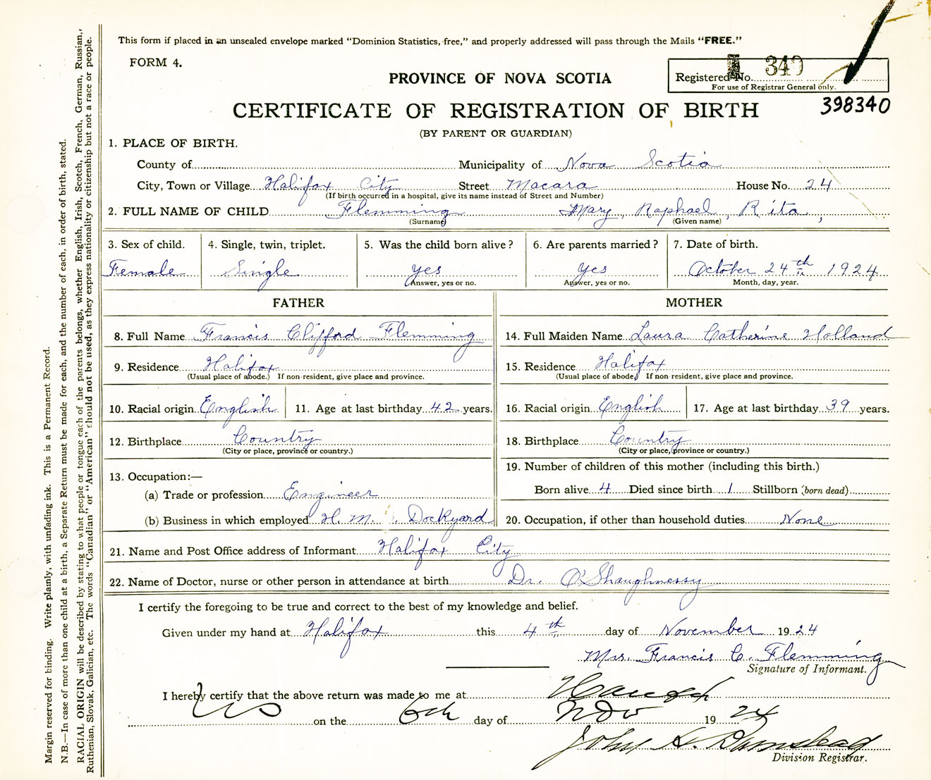 Female Birth Registration: Year: 1924 number: 39800340