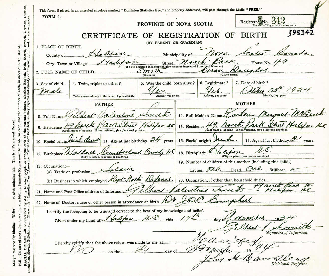 Male Birth Registration: Year: 1924 number: 39800342