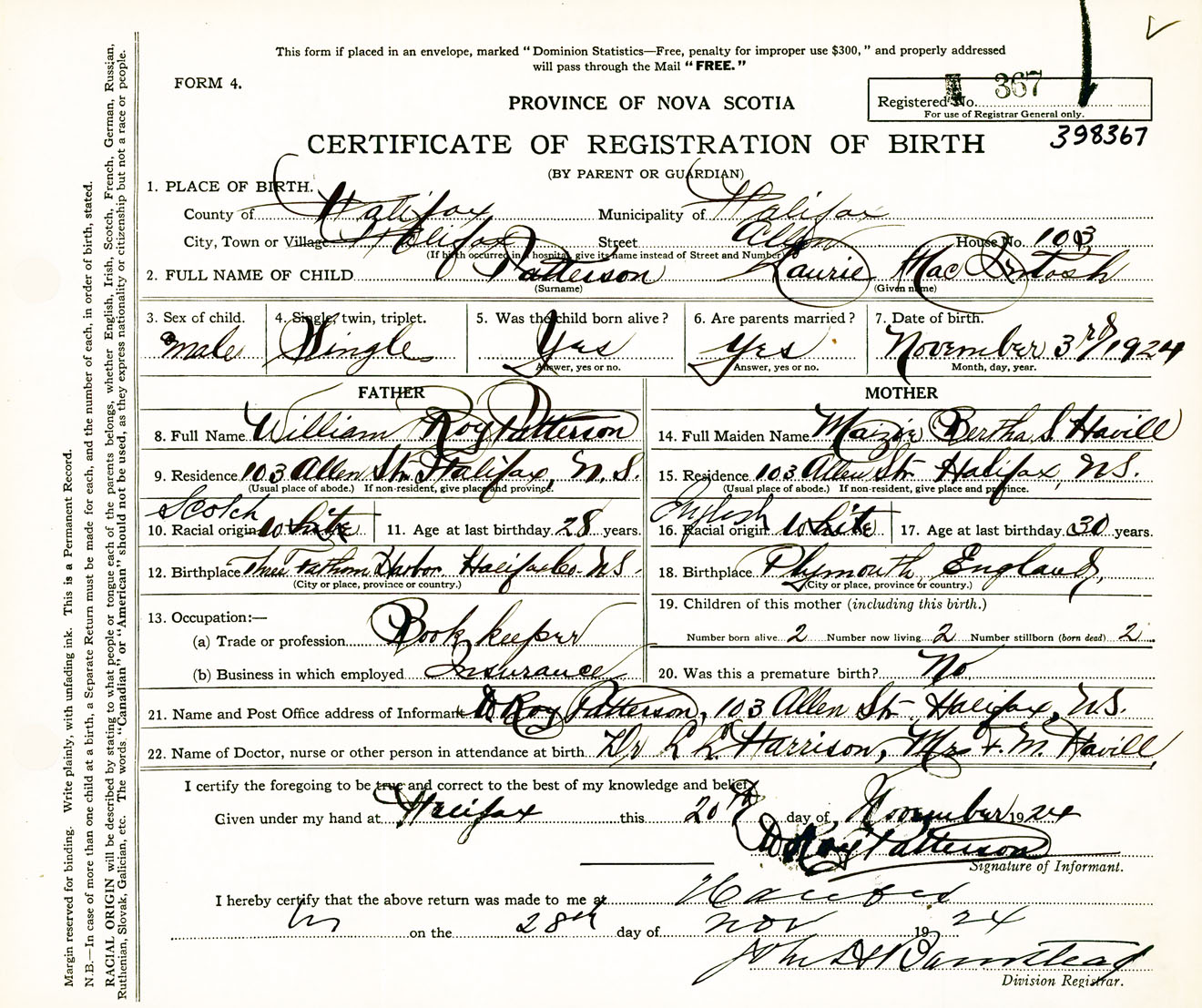 Male Birth Registration: Year: 1924 number: 39800367