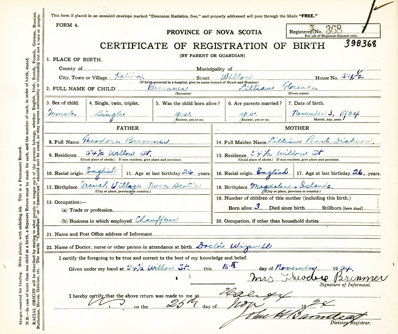 Female Birth Registration: Year: 1924 number: 39800368