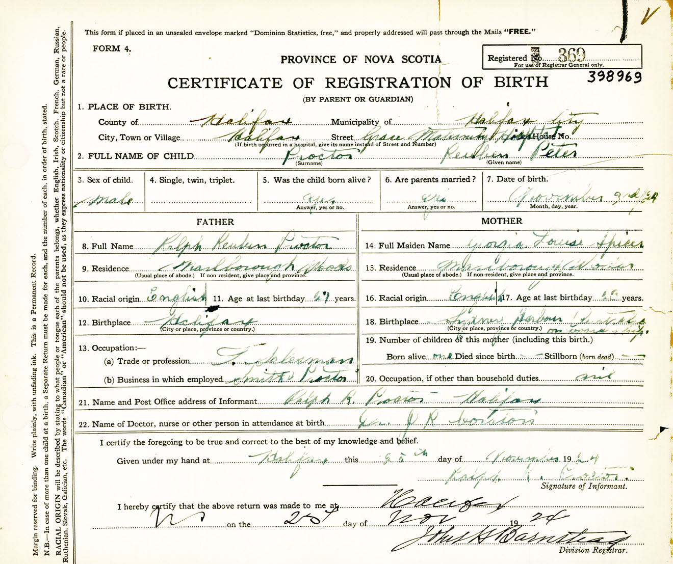 Male Birth Registration: Year: 1924 number: 39800369