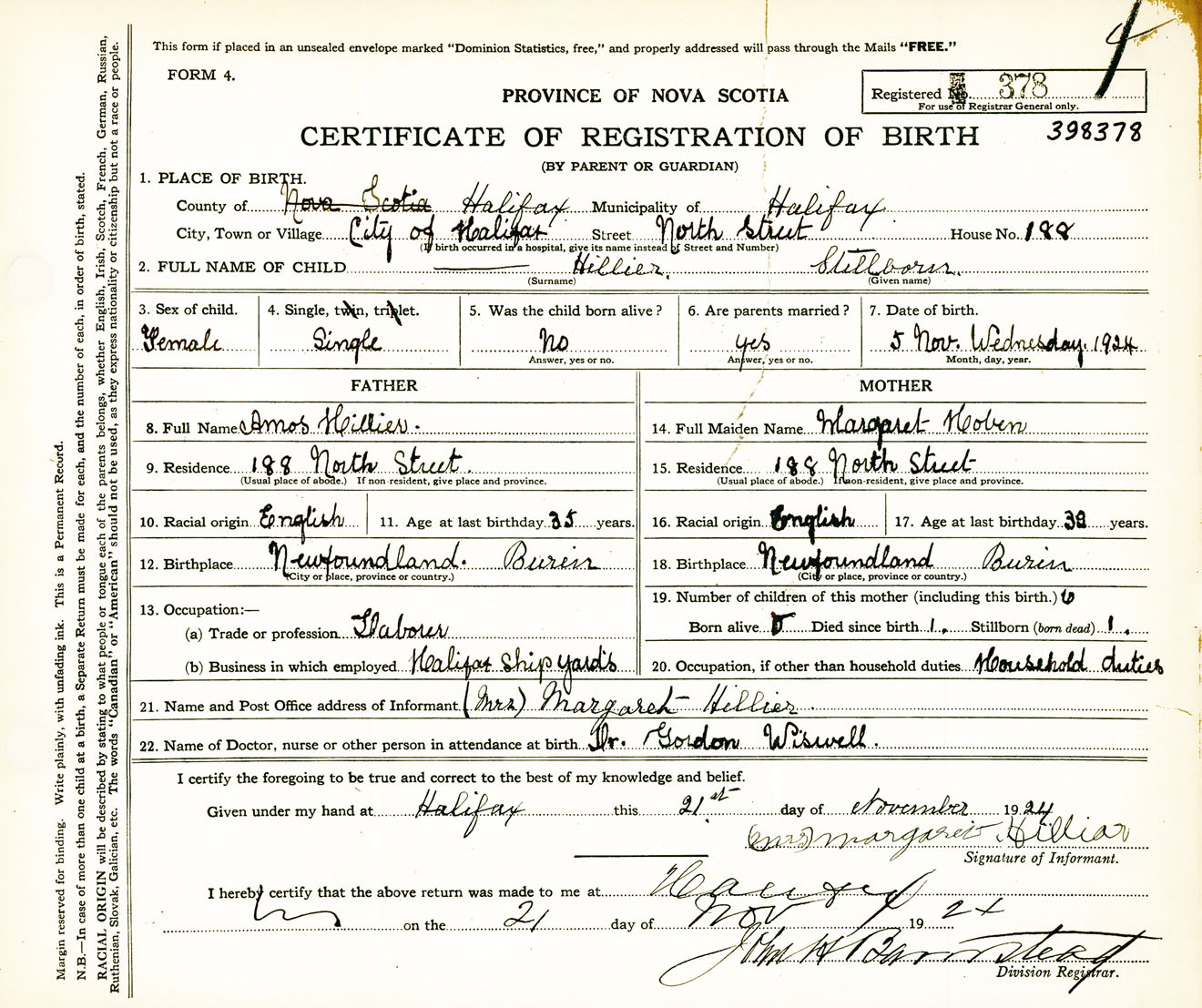 Female Birth Registration: Year: 1924 number: 39800378