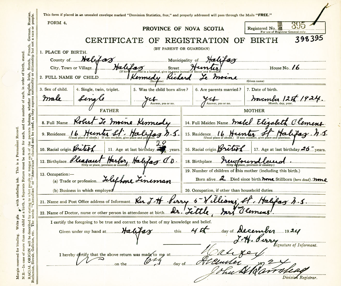 Male Birth Registration: Year: 1924 number: 39800395