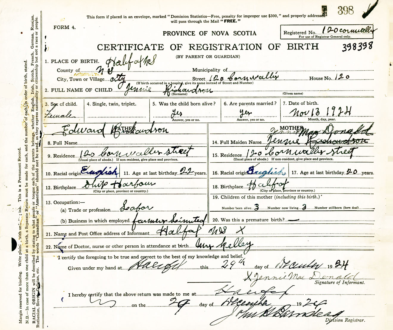 Female Birth Registration: Year: 1924 number: 39800398