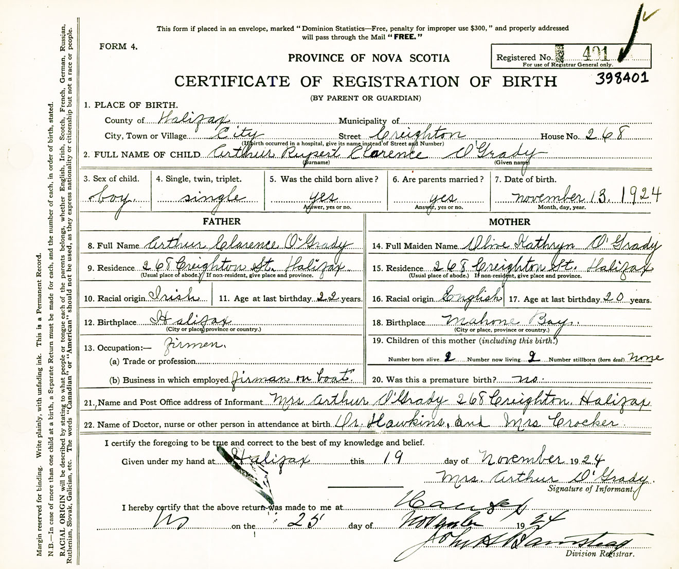 Male Birth Registration: Year: 1924 number: 39800401
