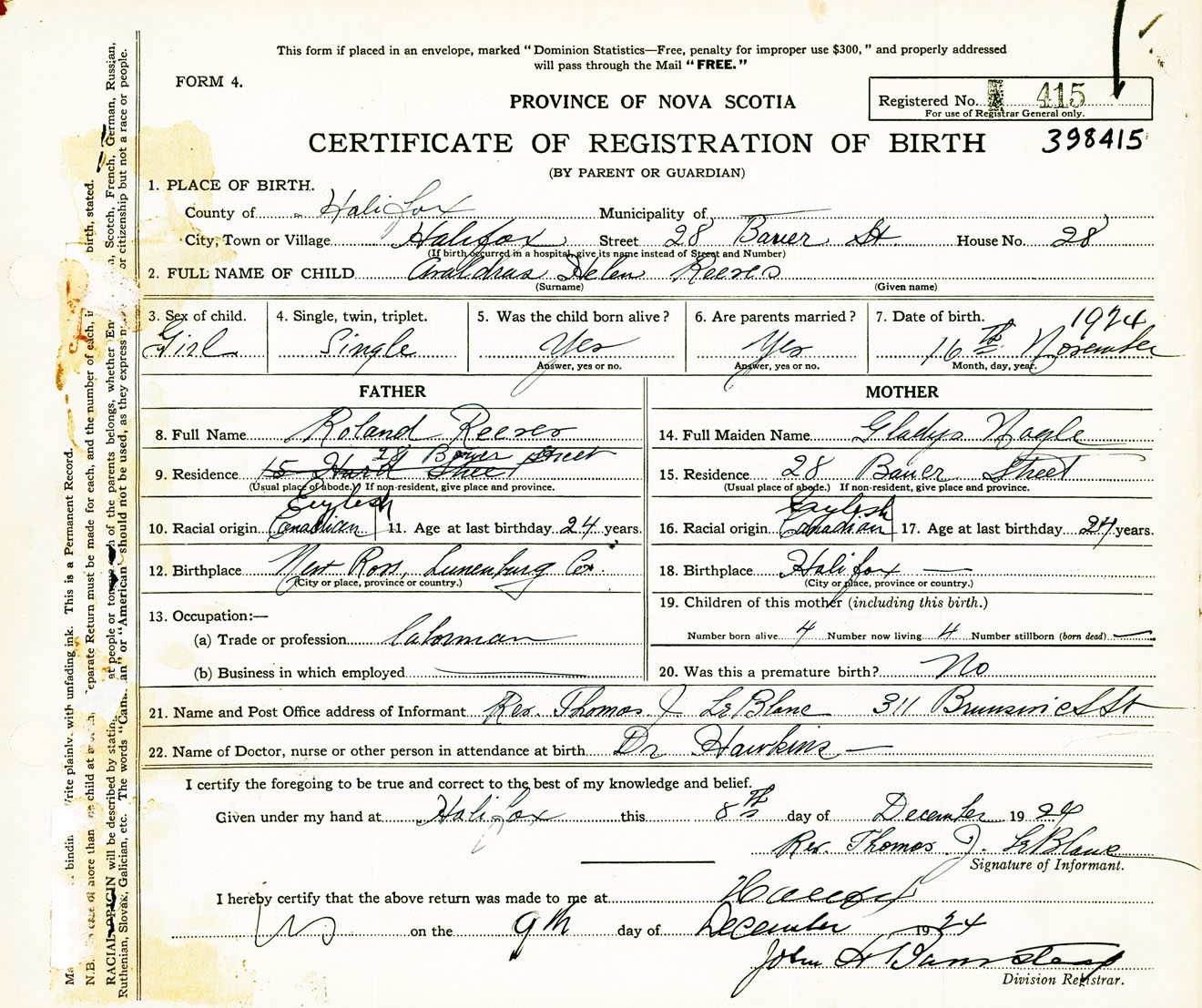 Female Birth Registration: Year: 1924 number: 39800415