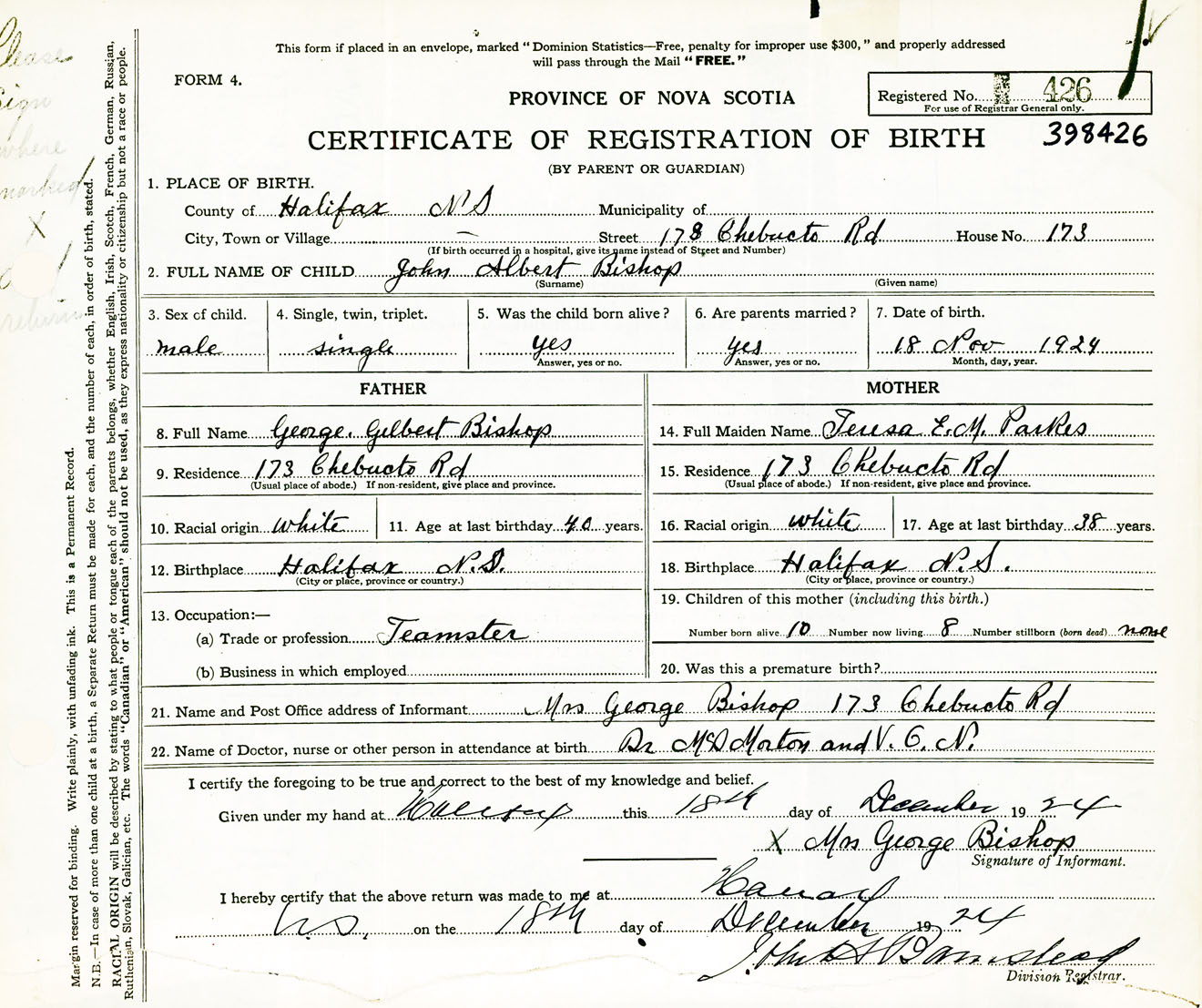 Male Birth Registration: Year: 1924 number: 39800426