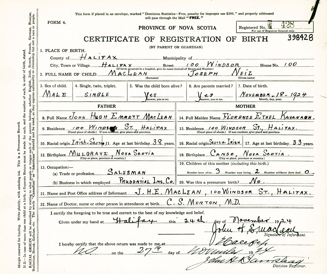 Male Birth Registration: Year: 1924 number: 39800428