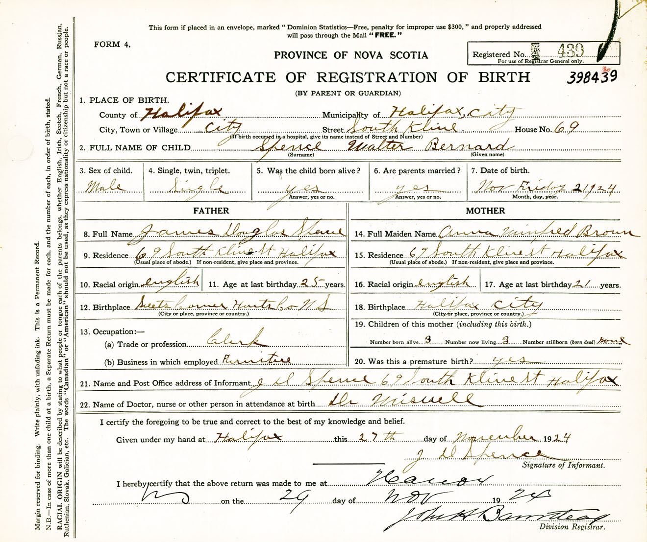 Male Birth Registration: Year: 1924 number: 39800439