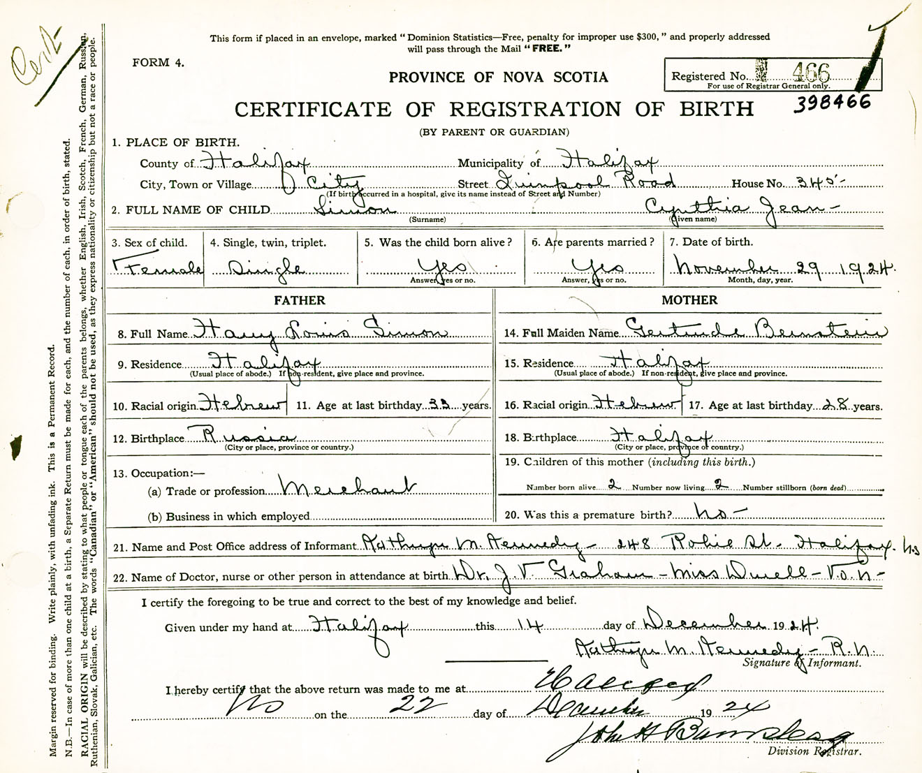 Female Birth Registration: Year: 1924 number: 39800466