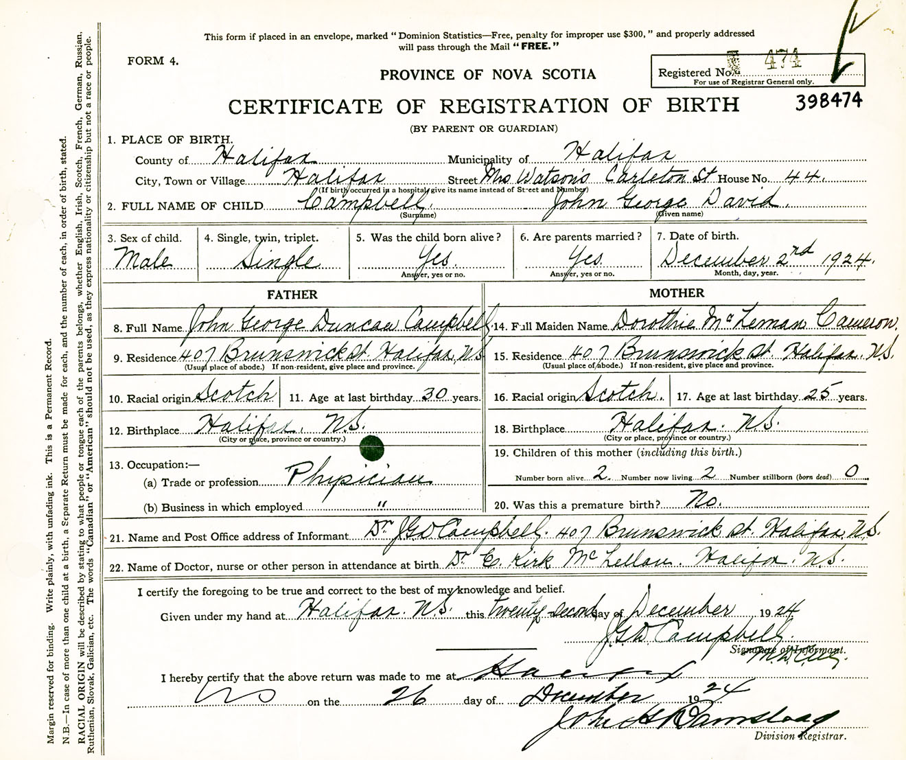 Male Birth Registration: Year: 1924 number: 39800474