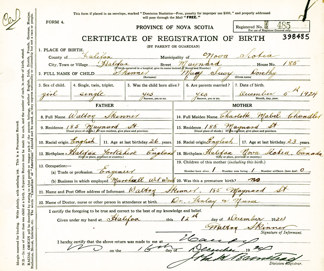Female Birth Registration: Year: 1924 number: 39800485