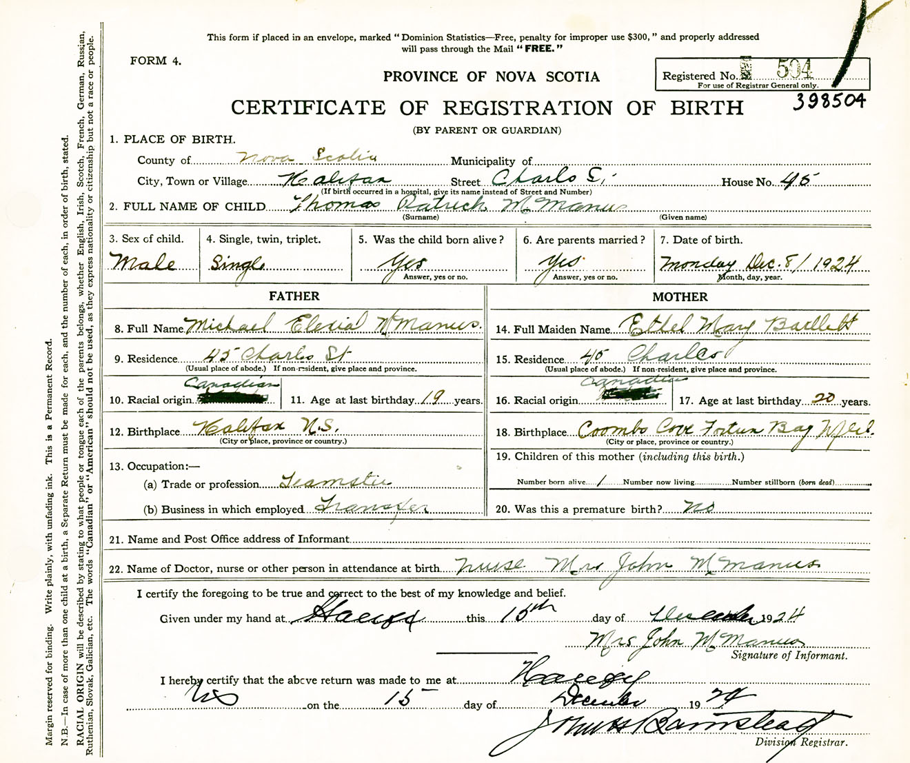 Male Birth Registration: Year: 1924 number: 39800504