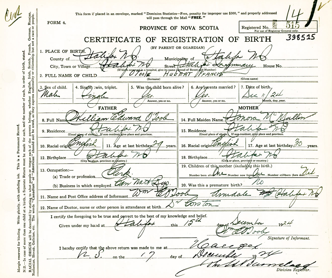 Male Birth Registration: Year: 1924 number: 39800515