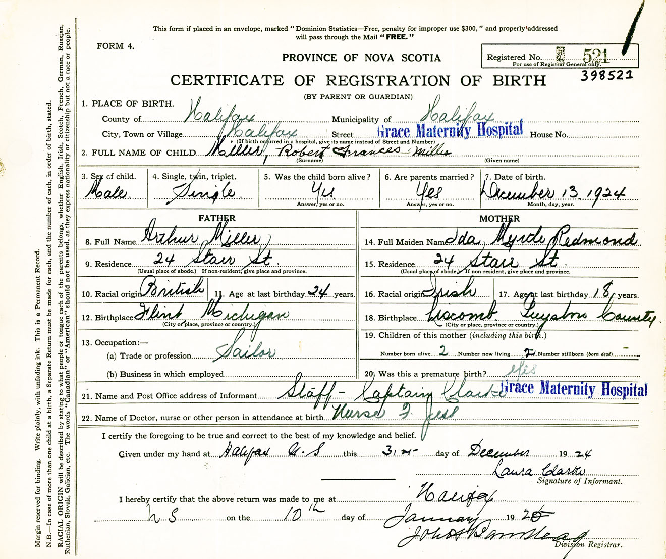 Male Birth Registration: Year: 1924 number: 39800521