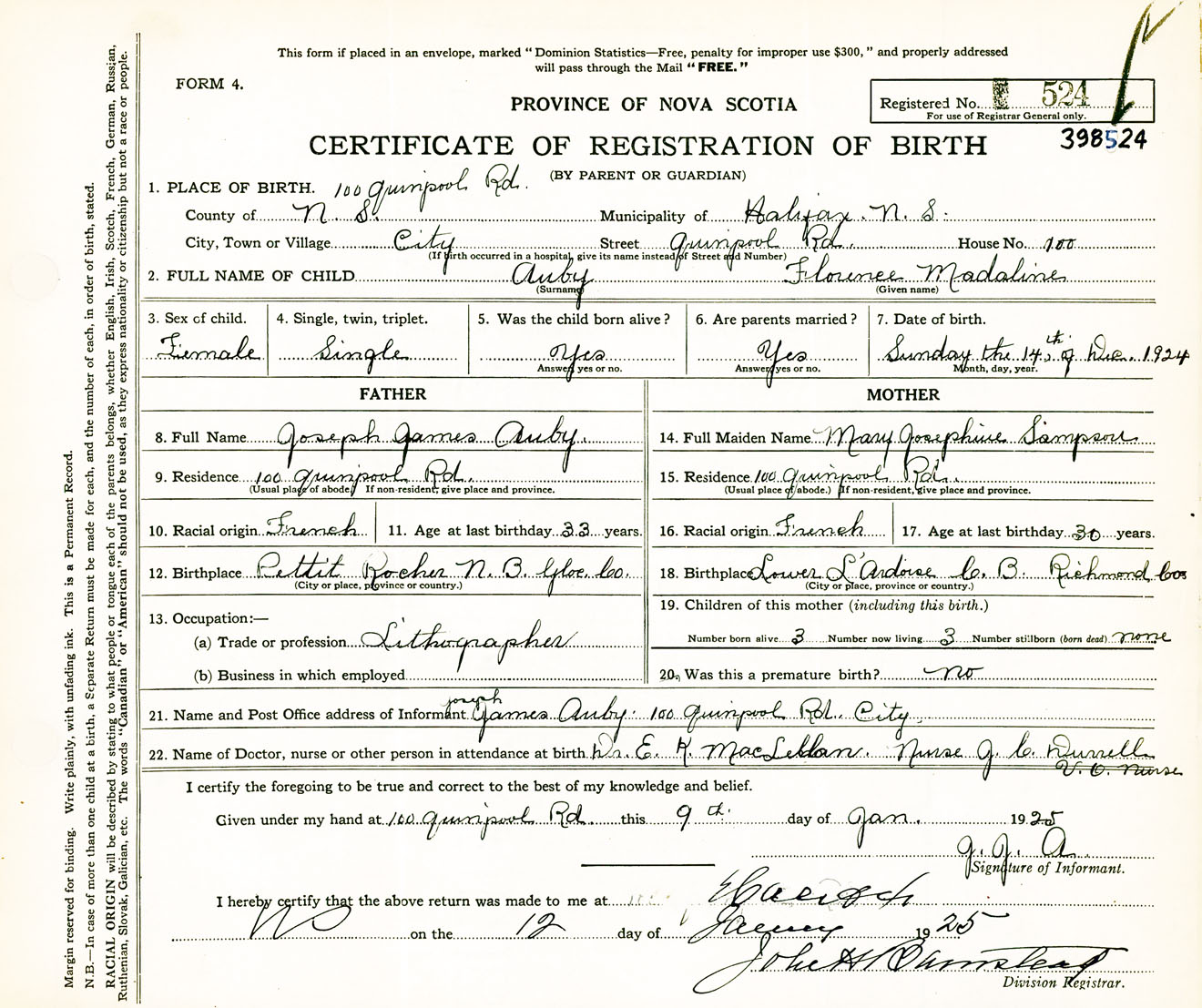 Female Birth Registration: Year: 1924 number: 39800524