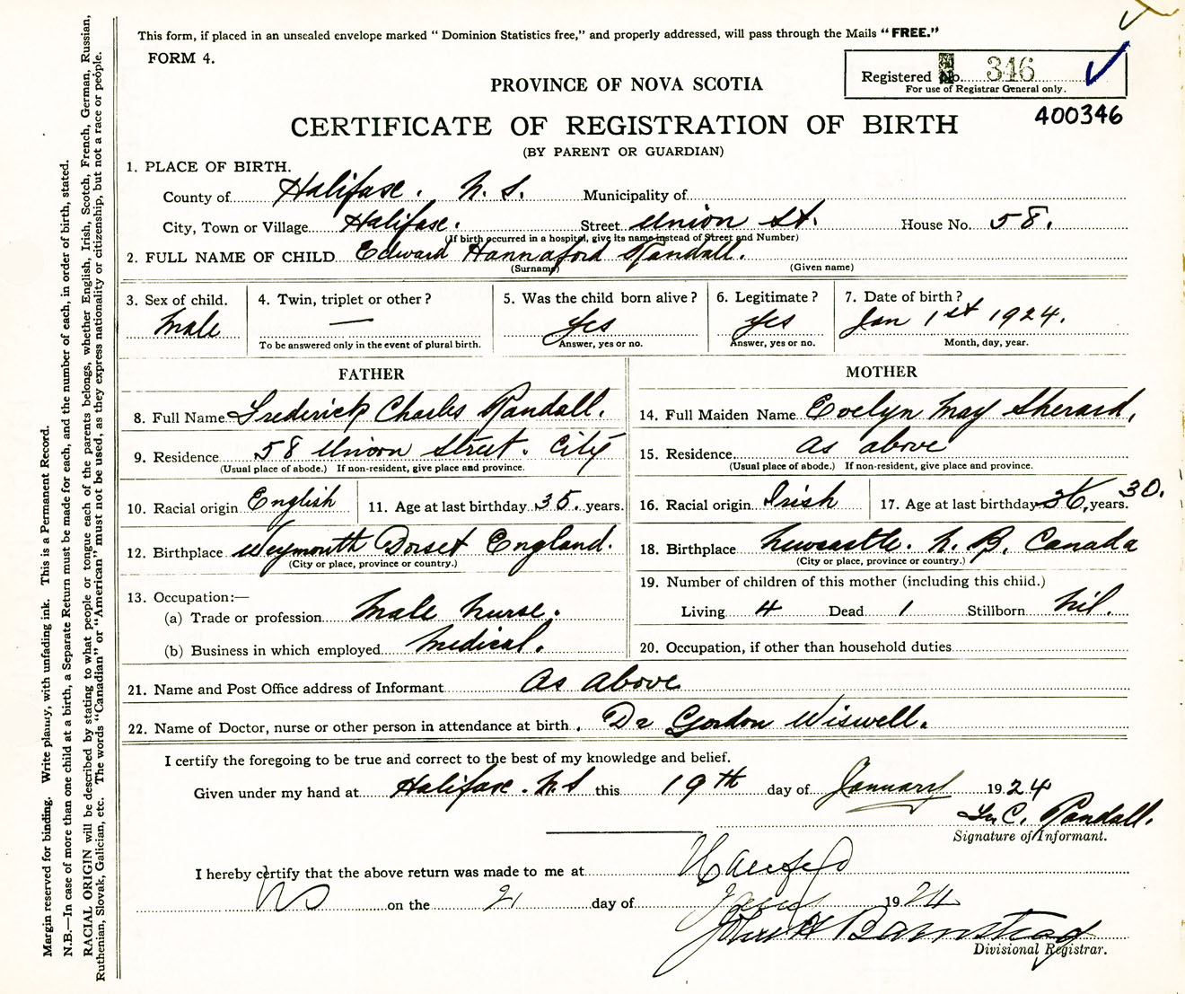 Male Birth Registration: Year: 1924 number: 40000346