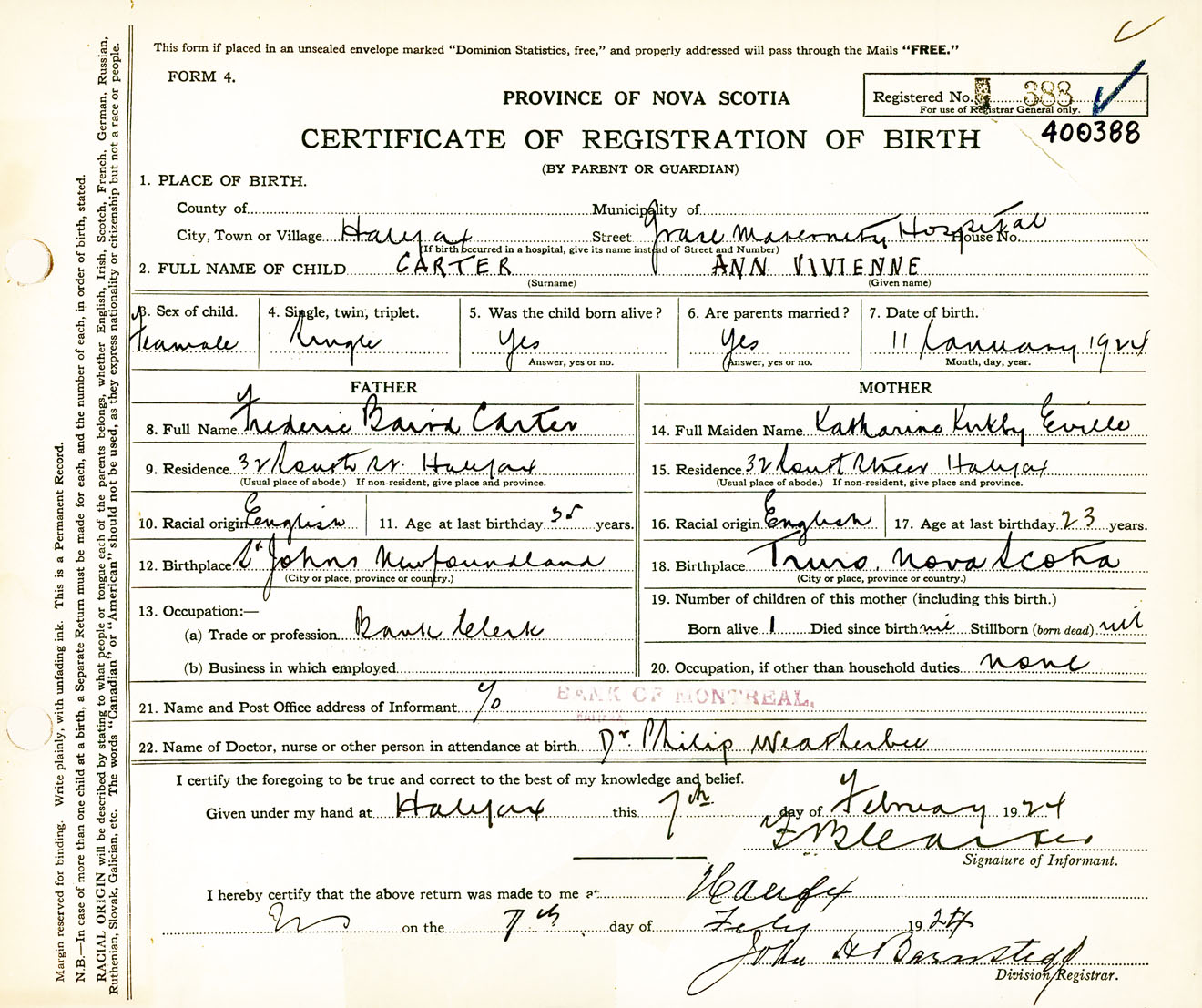 Female Birth Registration: Year: 1924 number: 40000388
