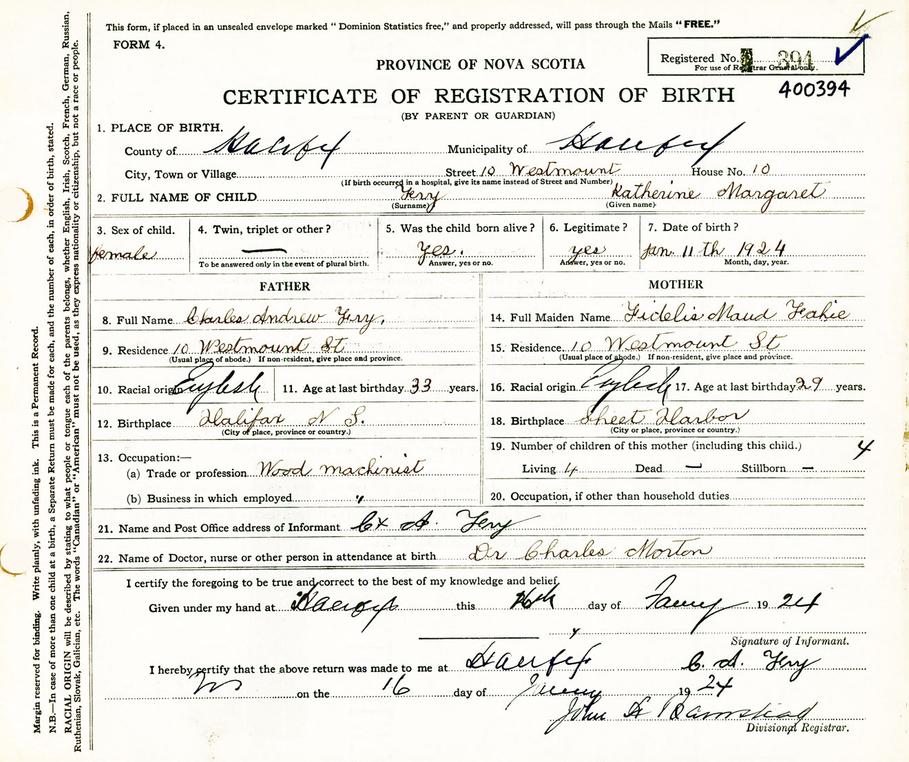 Female Birth Registration: Year: 1924 number: 40000394