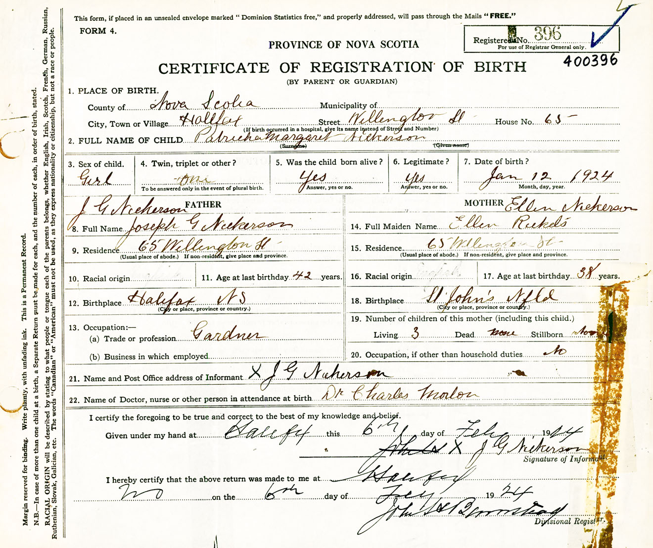 Female Birth Registration: Year: 1924 number: 40000396