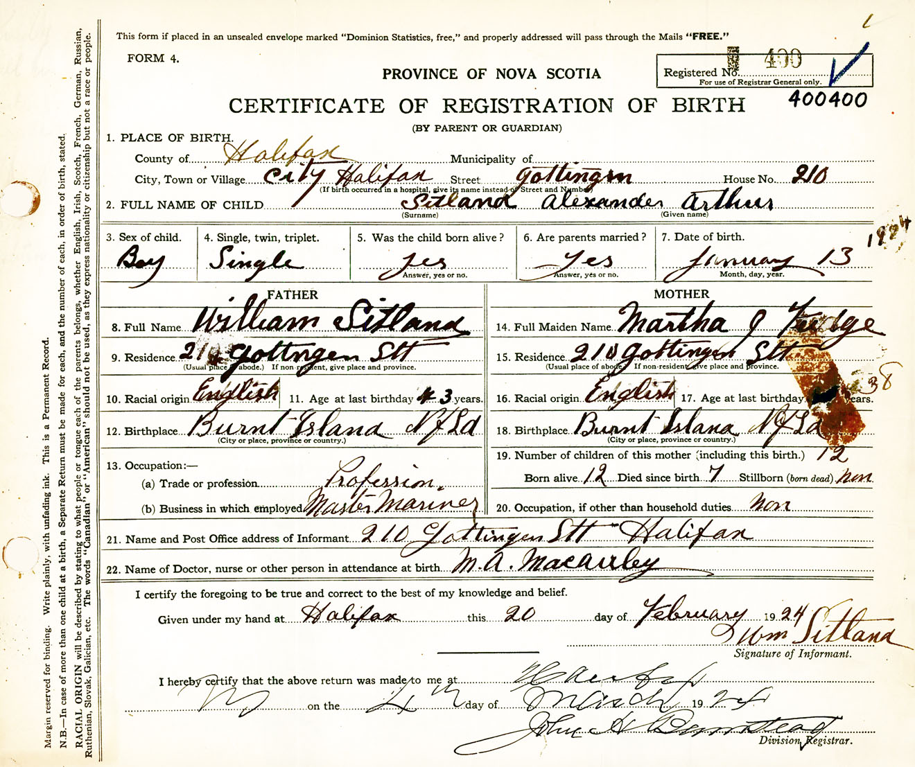 Male Birth Registration: Year: 1924 number: 40000400