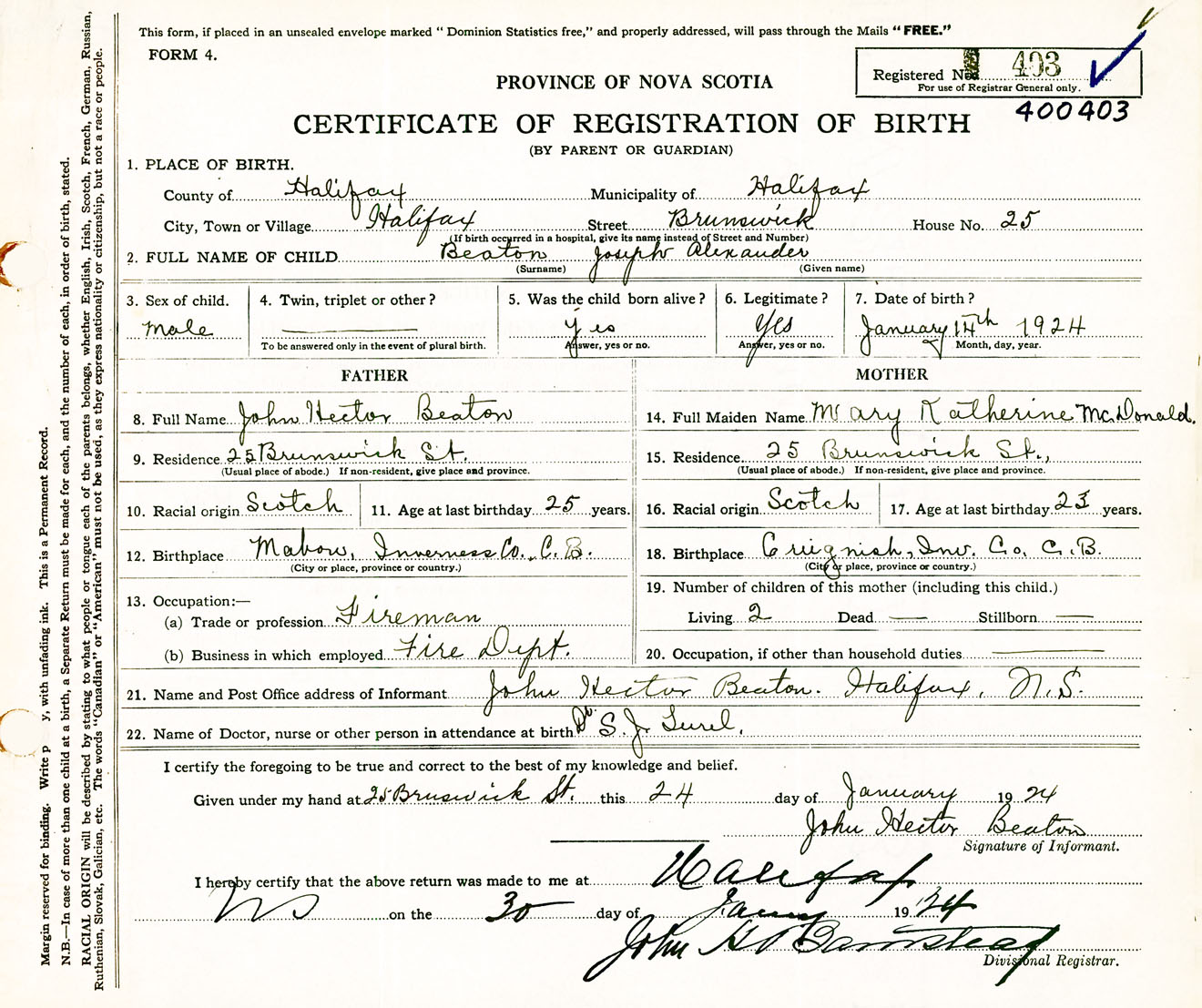 Male Birth Registration: Year: 1924 number: 40000403