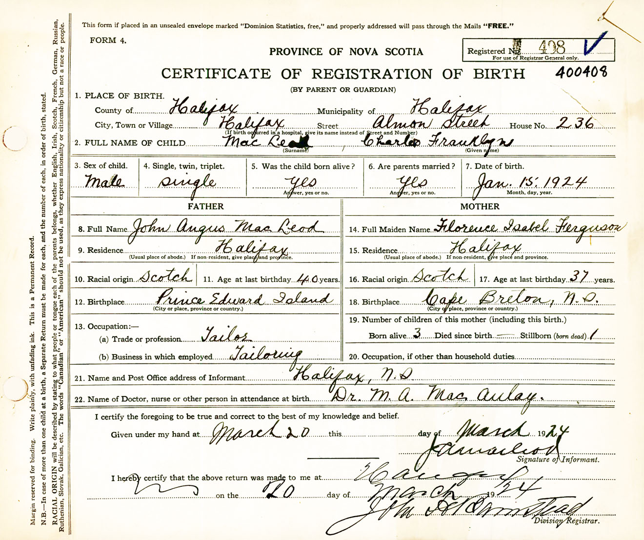 Male Birth Registration: Year: 1924 number: 40000408