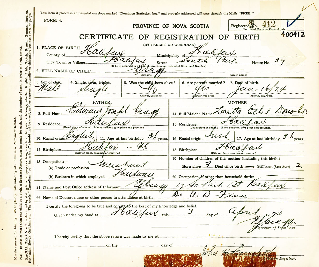 Male Birth Registration: Year: 1924 number: 40000412