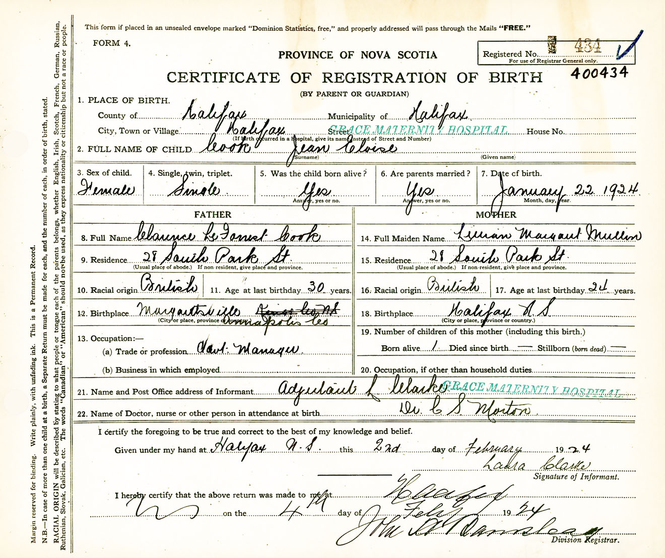 Female Birth Registration: Year: 1924 number: 40000434