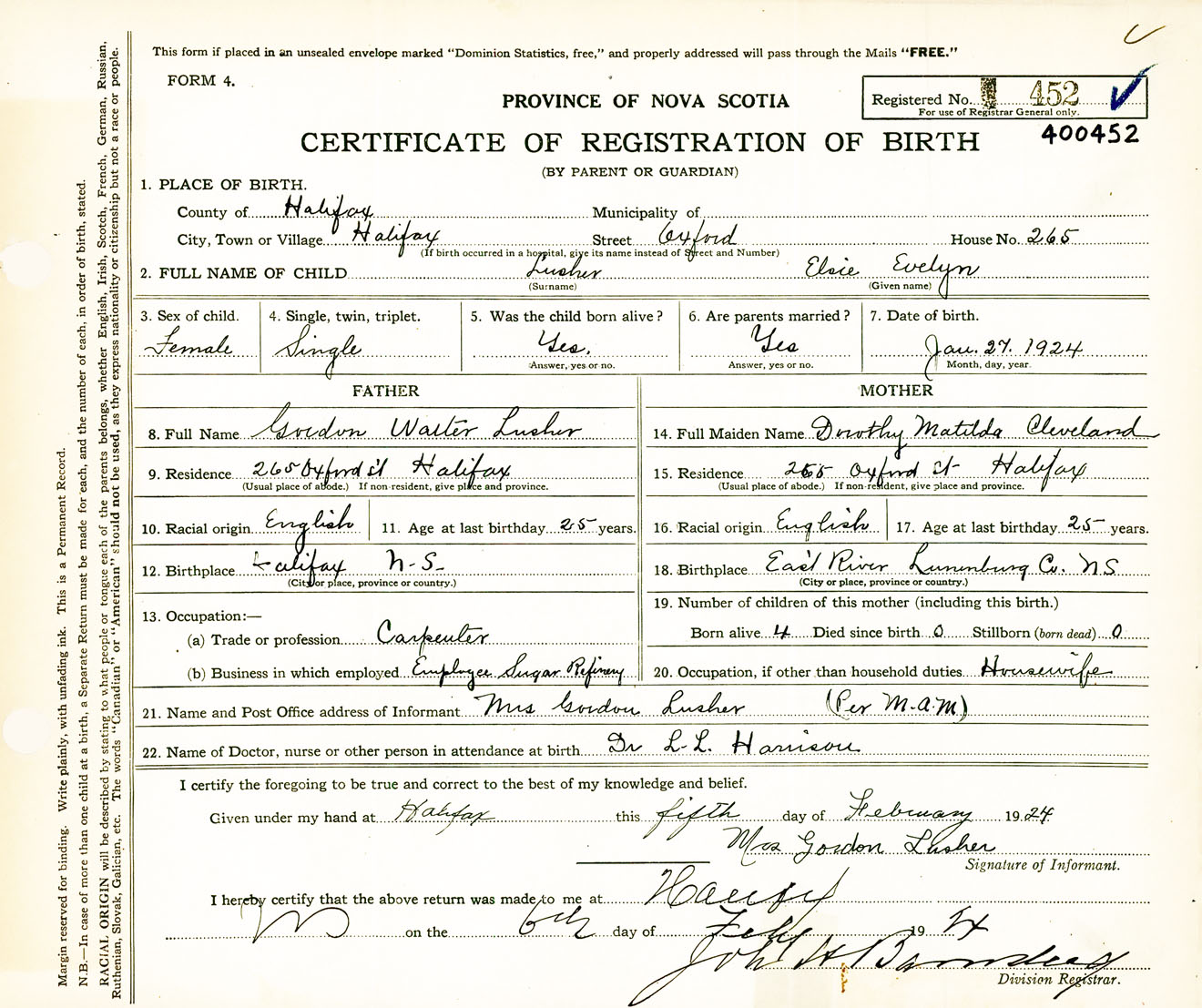 Female Birth Registration: Year: 1924 number: 40000452