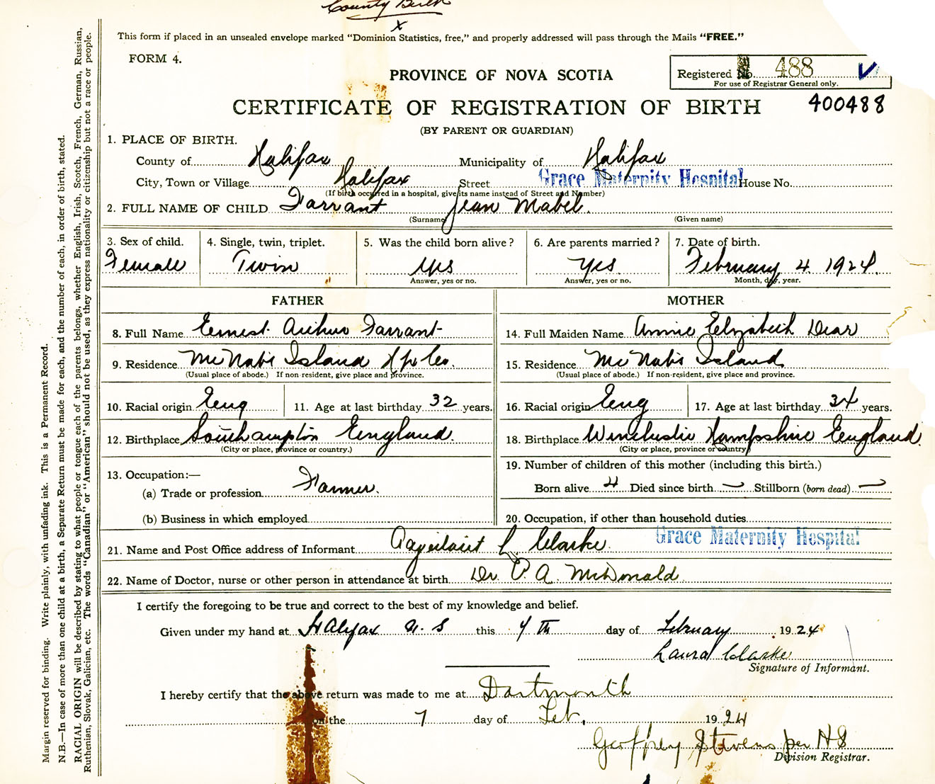 Female Birth Registration: Year: 1924 number: 40000488