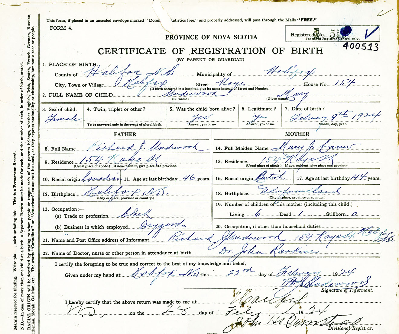 Female Birth Registration: Year: 1924 number: 40000513