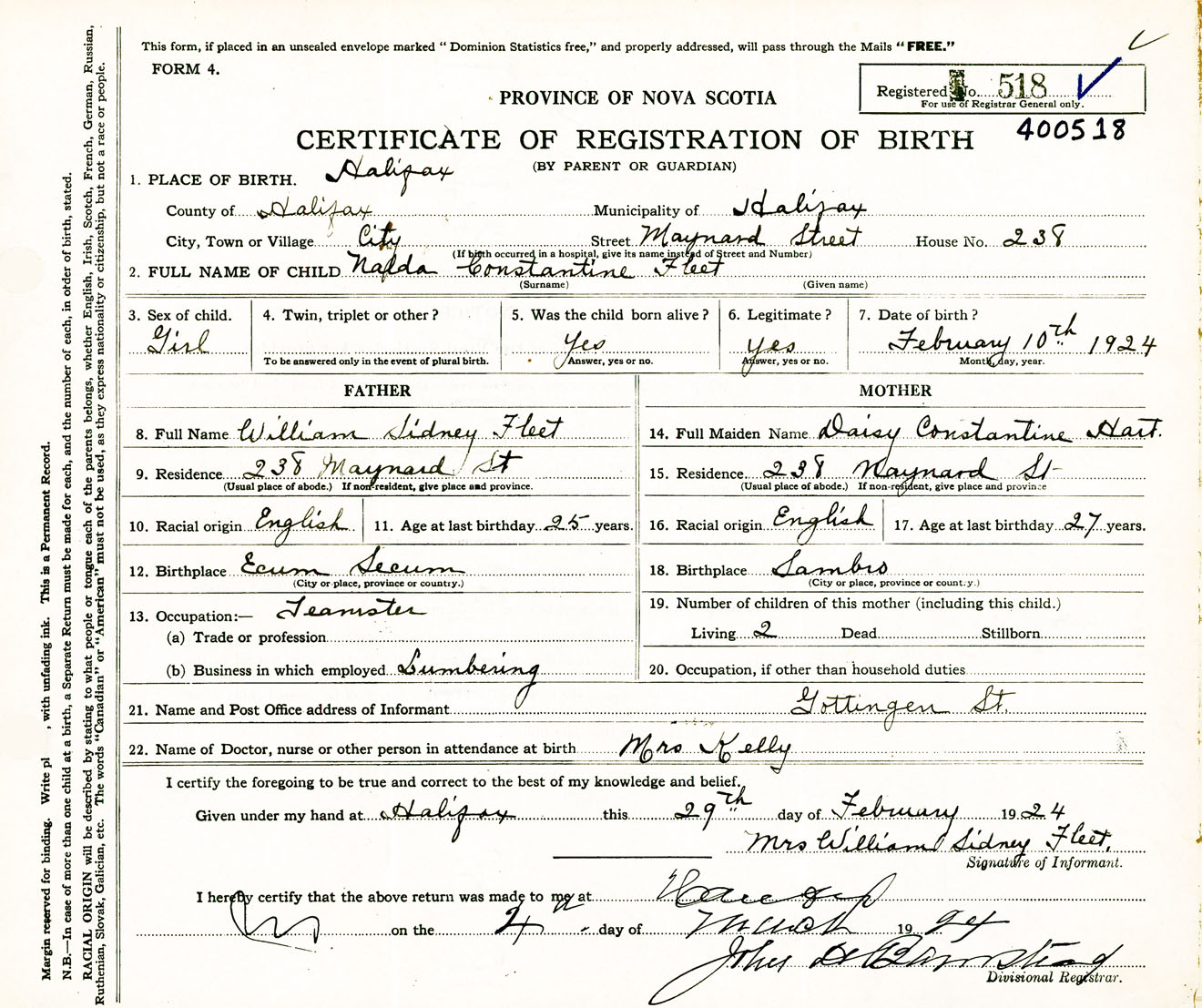 Female Birth Registration: Year: 1924 number: 40000518