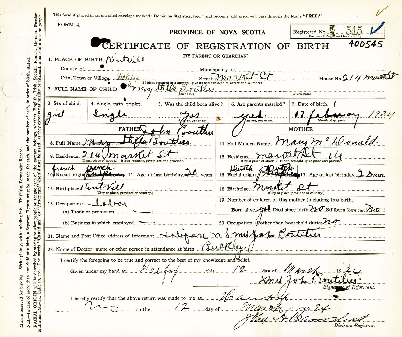 Female Birth Registration: Year: 1924 number: 40000545