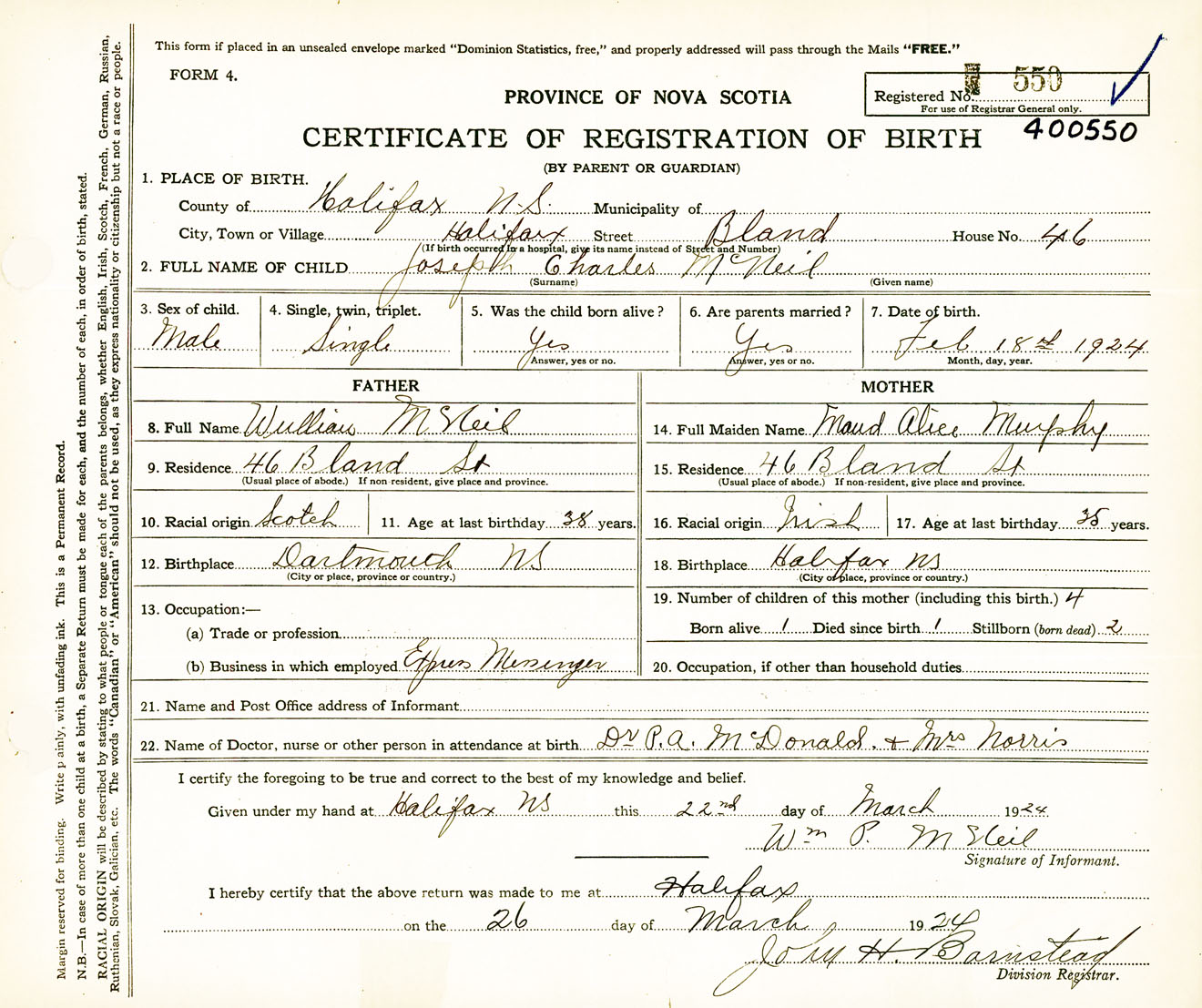 Male Birth Registration: Year: 1924 number: 40000550