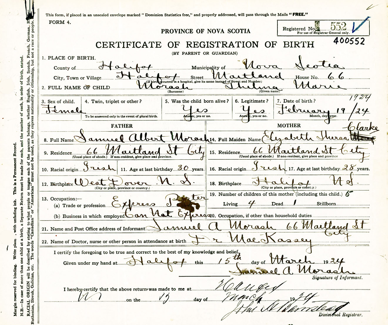 Female Birth Registration: Year: 1924 number: 40000552