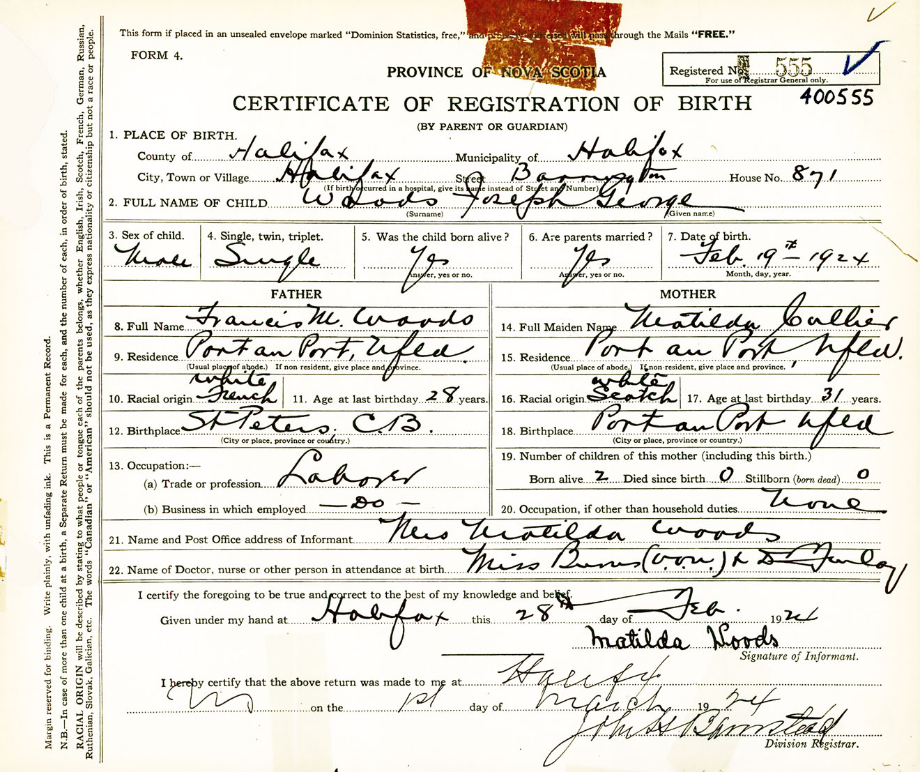 Male Birth Registration: Year: 1924 number: 40000555