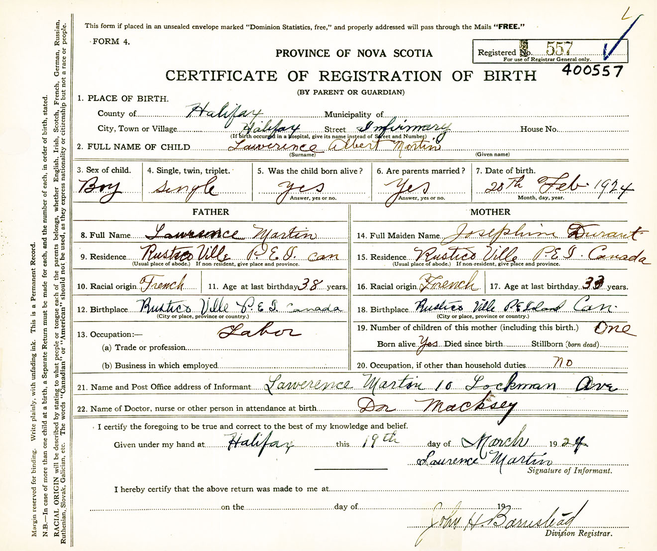 Male Birth Registration: Year: 1924 number: 40000557