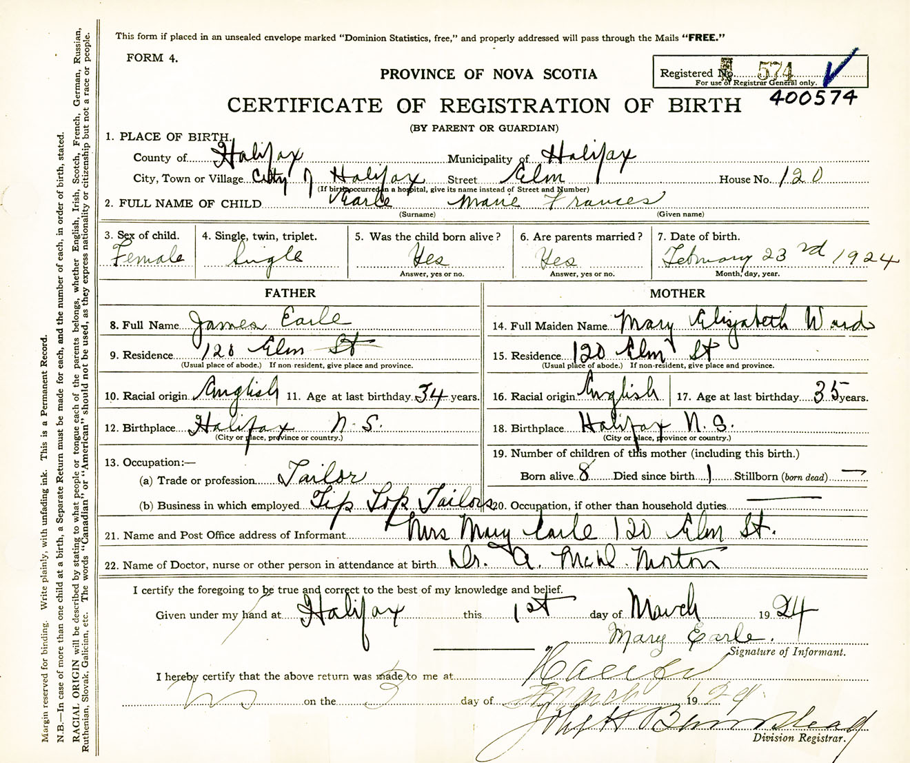 Female Birth Registration: Year: 1924 number: 40000574
