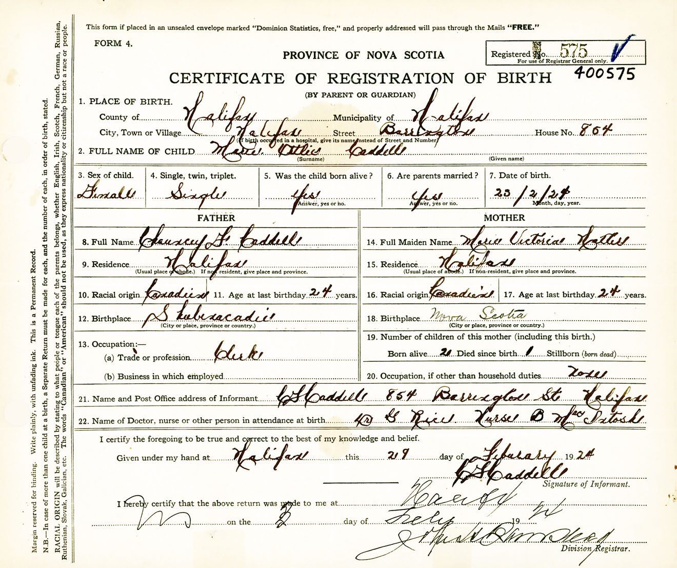 Female Birth Registration: Year: 1924 number: 40000575