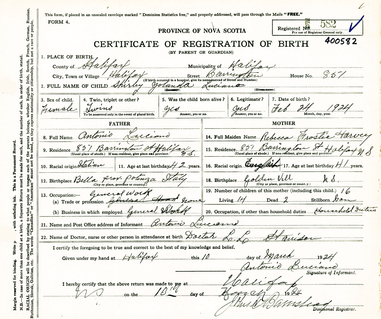 Female Birth Registration: Year: 1924 number: 40000582
