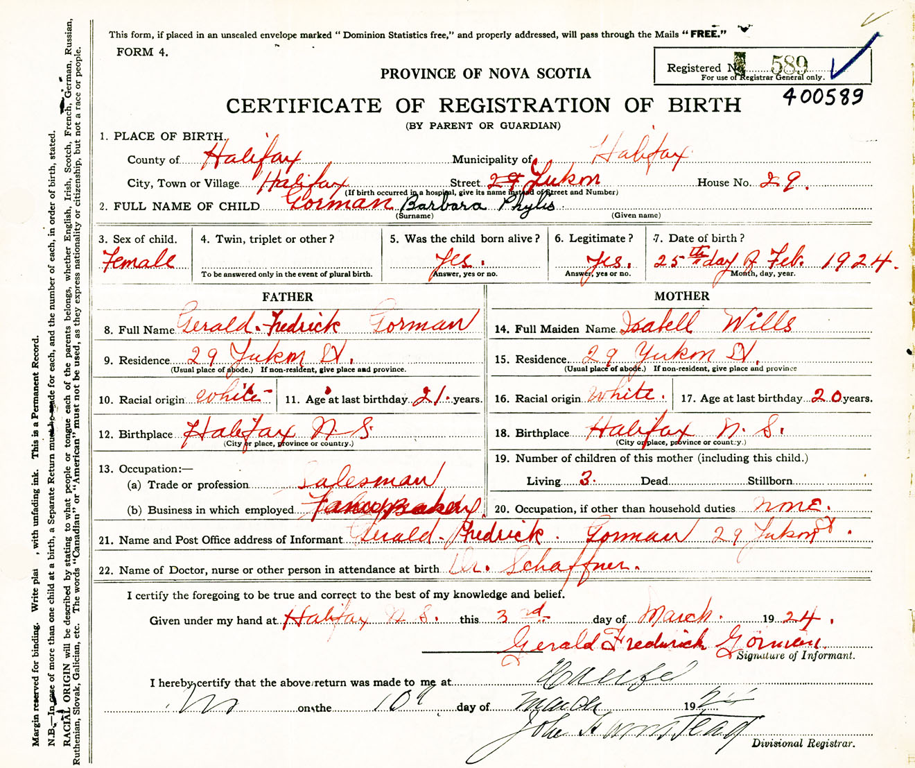 Female Birth Registration: Year: 1924 number: 40000589